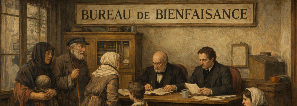 Le Bureau de bienfaisance trouve son fondement dans le décret du 7 frimaire an V (27 novembre 1796), consolidé sous le régime de Napoléon Bonaparte. Il s’inscrit dans la continuité des institutions charitables d’Ancien Régime, mais sous une forme profondément transformée : l’assistance devient un objet d’administration publique.